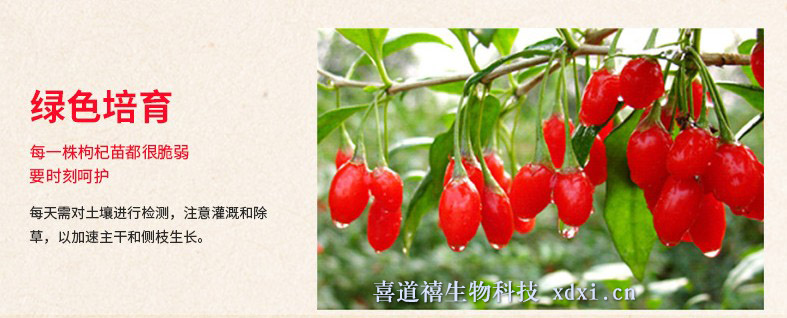 獨創枸杞最佳營養診斷平衡技術系統,研制了枸杞及枸杞茶樹專用季節有機肥,達到了質量與產量最佳的天然辯證匹配,喜道禧枸杞及茶葉是限量供給,有時想買還買不到。