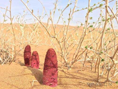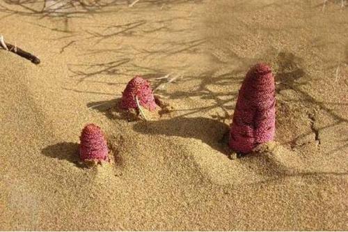 在干旱的沙漠地帶,鎖陽和蓯蓉是絕好的藥食兩用沙漠特種食材和補品,通 常漠外人很難發(fā)現(xiàn)它的蹤跡,如巧遇下雨,則雨后天晴時,藏在沙子里的鎖陽和蓯蓉會羞答答地露出頭,可采食, 這通常是在夏秋季節(jié)。