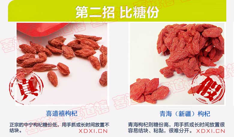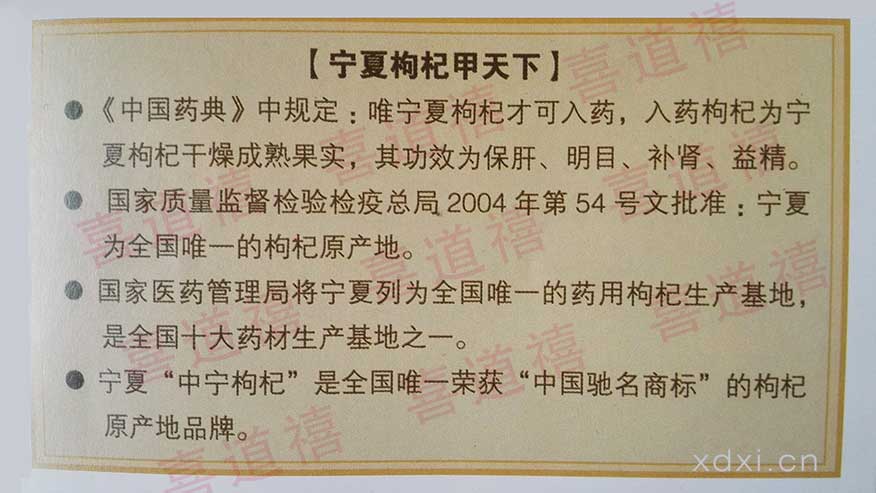 ■大小:通常,寧夏枸杞的顆粒不是很大。如果果粒過大,俗稱“小尖椒”,那就不是寧夏枸杞。一般寧夏枸杞的果粒不是特別的大,寧夏獨有的經緯度、地理、氣候條件、水源及土壤所含有的微量元素等等綜合要素造就了寧夏枸杞獨有的最佳藥用價值,但相對產量較低。這就是為什么正宗寧夏枸杞的價格是一個檔次、正宗寧夏有機枸杞的價格又是另一個檔次!喜道禧枸杞,好枸杞可以貴一點。