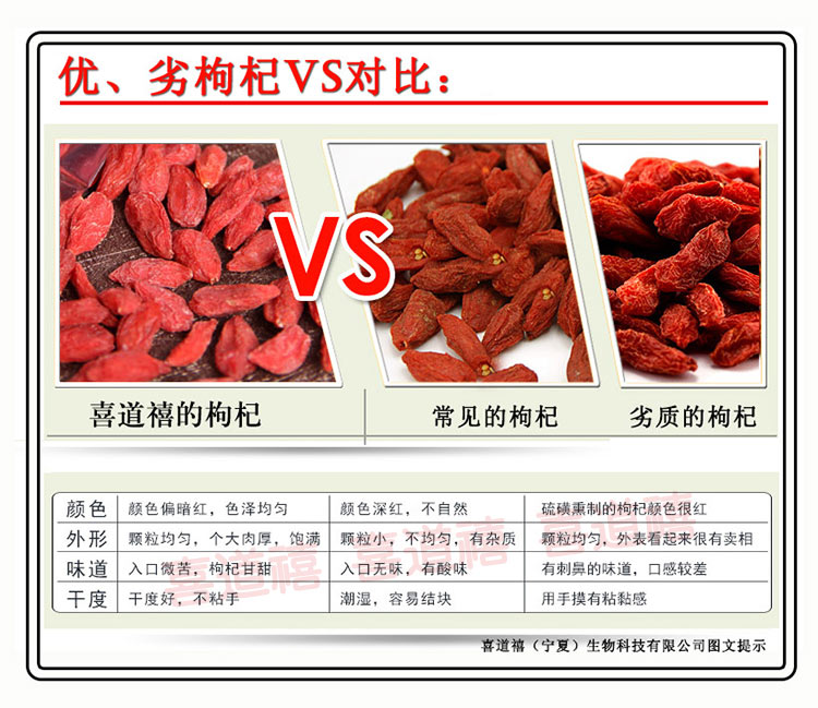 備注:該對比圖只是好枸杞與一種劣質貨的對比情況,全國市場中,劣質枸杞的表現形態還有好多種賣相。)
