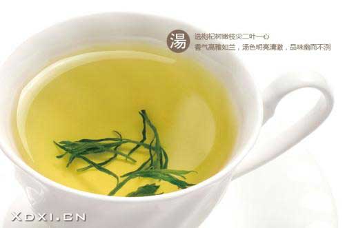 養生專家建議我們: 枸杞芽茶的沖泡也適用于功夫茶具,取1~3克枸杞芽茶投入杯中,用80℃的開水快速洗茶,第一泡出茶時間為10秒左右,后續沖泡出茶時間依次延長,2泡后可將茶葉嚼服。